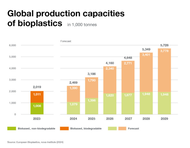В целом, мировое производство пластика продолжает неуклонно расти. Как показывает отчет, это развитие обусловлено ростом спроса в сочетании с появлением все более сложных сфер применения и продуктов. Соответственно, мировые мощности по производству биопластика должны значительно увеличиться с примерно 2,47 млн т в 2024 г. до примерно 5,73 млн т в 2029 г.