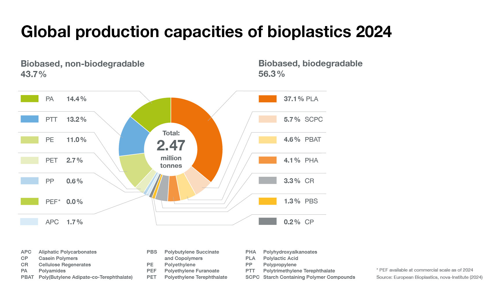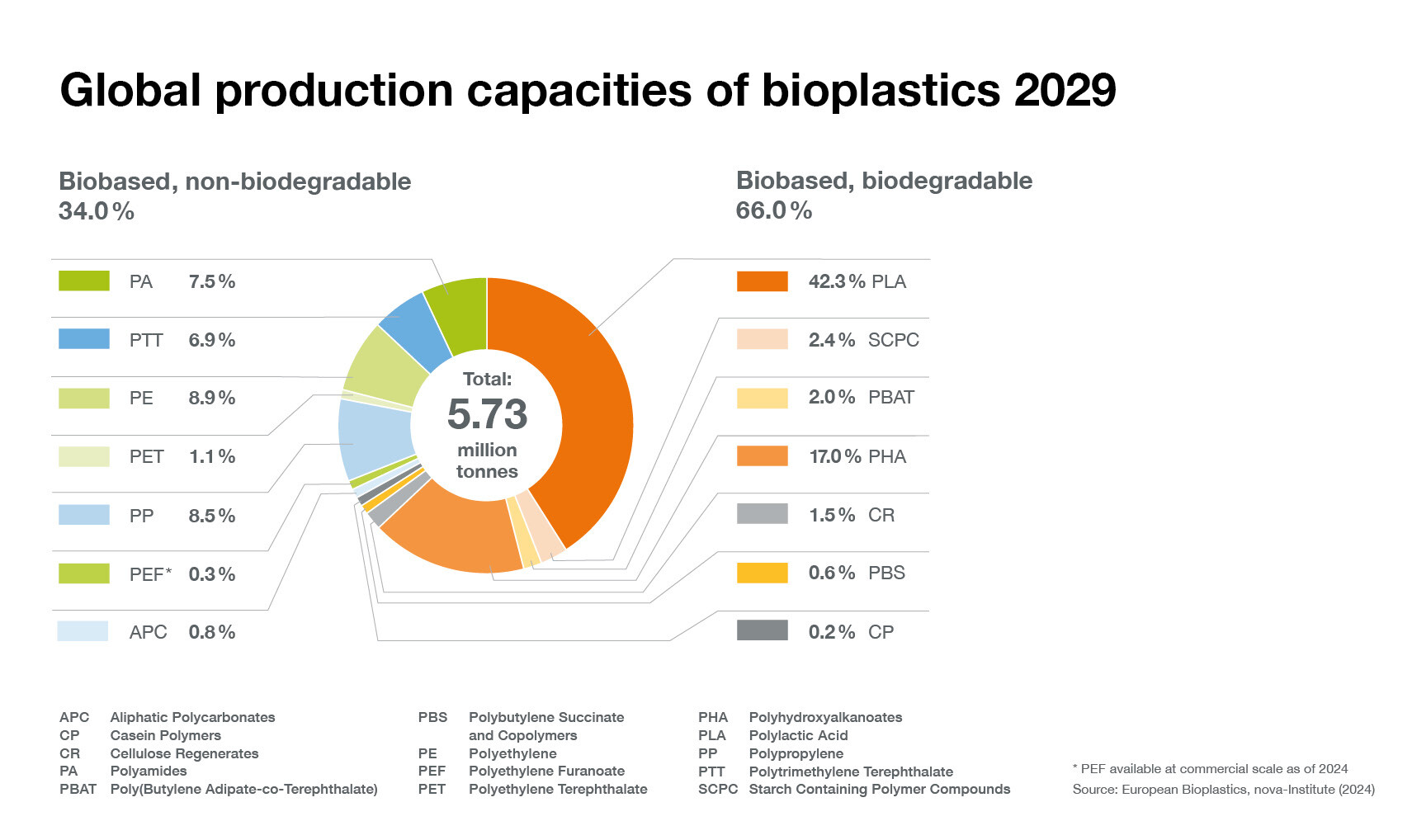 Альтернативы в качестве биопластиков существуют практически для каждого обычного пластикового материала и соответствующей сферы применения. Согласно данным отчета, благодаря сильному развитию полимеров на биооснове, биоразлагаемых полимеров, таких как полимолочная кислота (PLA) и полигидроксиалканоаты (PHA), полиэтилен (PE) на биолоснове, а также устойчивому росту полипропилена (PP) на биооснове производственные мощности продолжат значительно расти в течение следующих 5 лет.