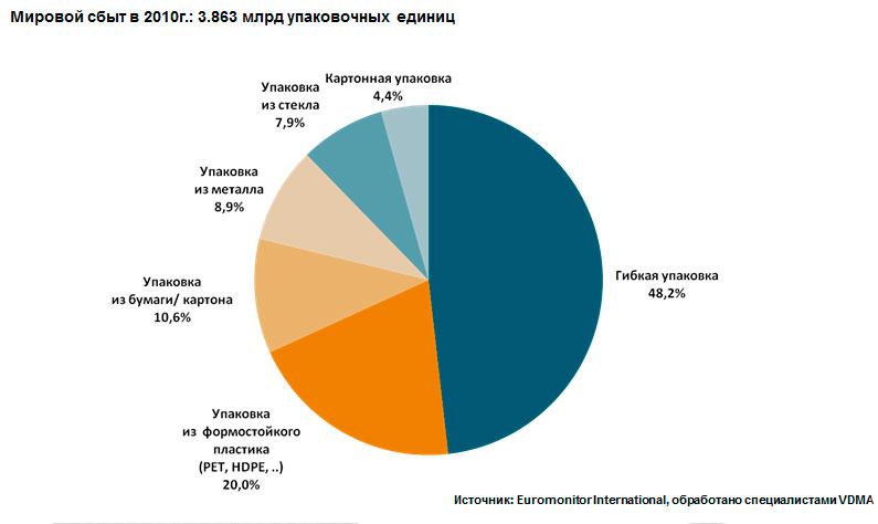 Согласно статистическим данным, мировой объем сбыта упаковки в 2010 году составил 3,863 млрд единиц, из них большая часть – это упаковка для продуктов питания (1,723 млрд ед.) и напитков (994 млрд).