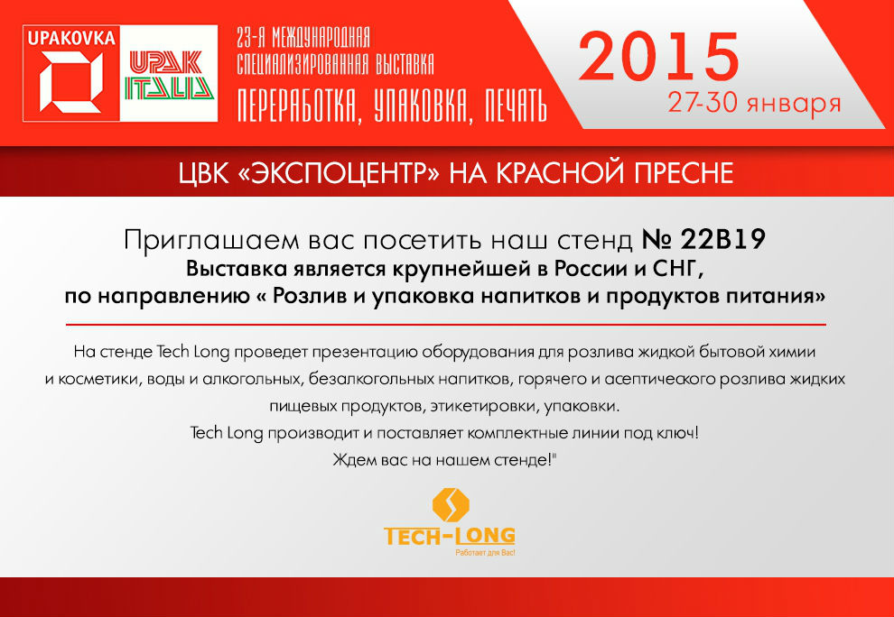 На стенде Tech Long (№ 22B19) проведет презентацию оборудования для розлива жидкой бытовой химии и косметики, воды и алкогольных, безалкогольных напитков, горячего и асептического розлива жидких пищевых продуктов, этикетировки, упаковки.