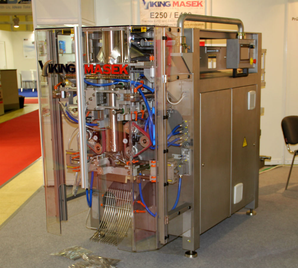 Такими экспонатами были: упаковочные машины «флоупак» модели Pearl от итальянской группы PFM, модели Florida от группы Ulma (Испания), VFFS-машины чешских производителей – модели HSV 360 в варианте «дойпак» (о ней достаточно подробно рассказывалось в отчете о прошлогодней «Упаковке/УпакИталии») от Velteko и модели S250 от Viking Masek. Кстати, во многом благодаря поредевшему «лесу», углядел необычные габариты последнего изделия: явно больший размер в глубину. На стенде рассказали, что в машине электрошкаф, традиционно помещающийся сбоку от основной станины, перенесен в противоположную от лицевой панели сторону.