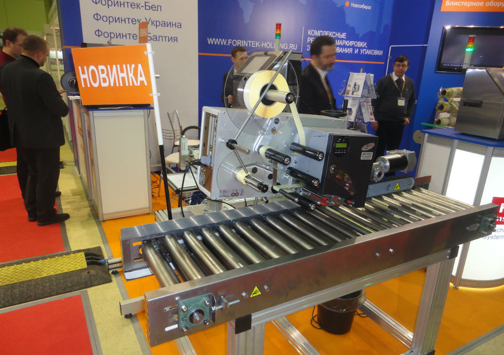 На стенде «Форинтек» принтер-аппликатор Avery Dennison ALX 924 был установлен в составе конвейерной этикетировочной системы, позволяющей наносить круговые этикетки на цилиндрические объекты