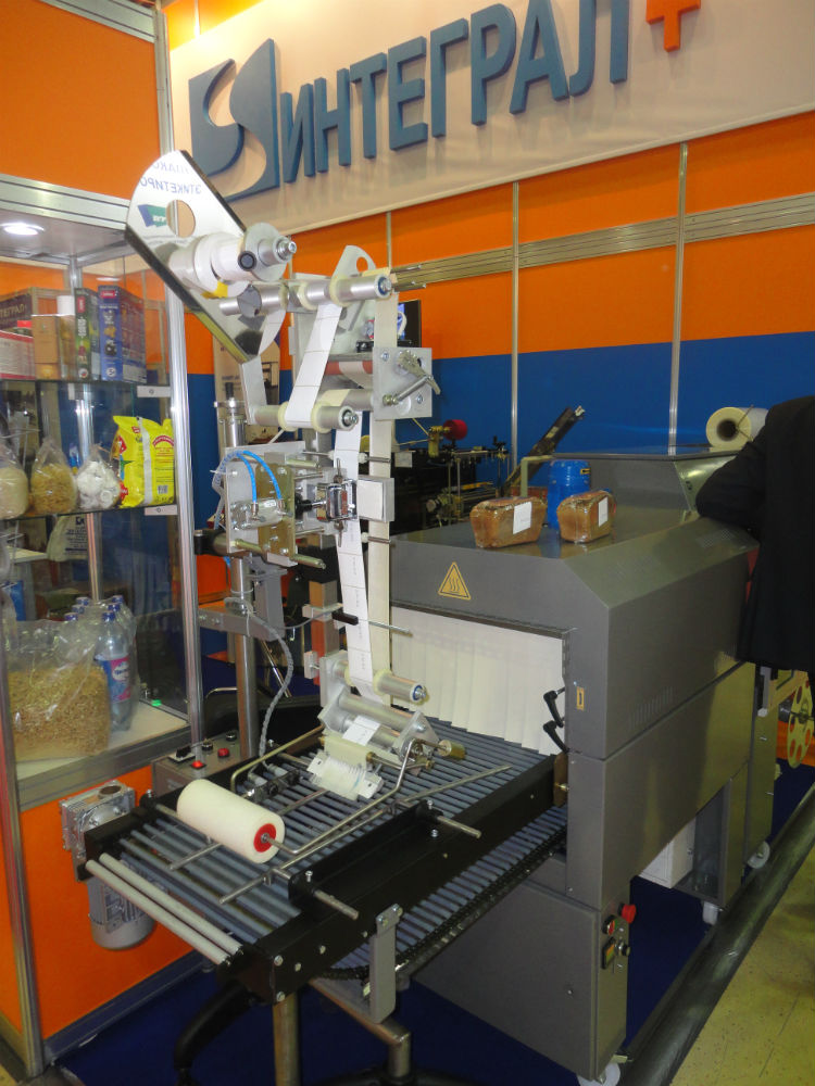 Фирма «Интеграл» продемонстрировала на стенде работу своего аппликатора, установленного на выходе из конвейера, транспортирующего хлебные изделия