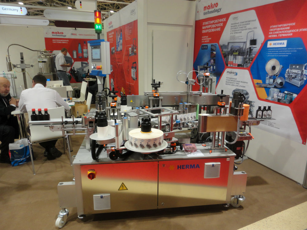 Специалисты Makro Technology показывали широкий спектр этикетировочных систем компании Herma на стенде Gaisbauer Technical Solutions. Назначение универсальной автоматической системы Herma 362 E с конвейером – нанесение от одной до двух этикеток по всей окружности (или с двух сторон) цилиндрического или эллиптического продукта. Машина с производительностью до 70 объектов в минуту при круговой этикетировке (100 объектов при двухсторонней) имеет высокий класс защиты IP66, оснащена боковым приводным узлом выравнивания этикетируемого объекта (высота 50-290 мм, диаметр до 100 мм). В составе системы ленточный конвейер длиной 2000 мм, два сервоприводных аппликатора H400 V160, выдающих этикетки со скоростью 40 м/мин (диаметр рулона 300 мм, ширина – 160 мм). В состав линии может устанавливаться принтер или система горячего тиснения фольгой.