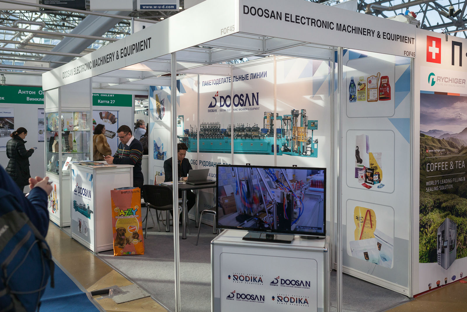 Но в процессе работы выставки выяснилось, что в этом были и свои преимущества. За не слишком густым «лесом» экспонатов легче удавалось разглядеть «дерево», достойное внимания Легче было разговаривать с представителями компаний об их прогрессивных разработках, о перспективах развития техники, не отвлекаясь на стоящее рядом оборудование. Так, я узнал о новой технике, над которой работает сейчас Rovema (Германия). На объединенном итальянском стенде кое-что узнал о новых разработках компаний Cavanna и IMA, чье оборудование давно не видел. Или, немного поспорив с представителем компании Doosan (Южная Корея) о том, какая техника эффективнее: та, что формирует и наполняет тару из гибких полимерных материалов, или та, которая выполняет эти операции по отдельности, я познакомился с их действительно интересным оборудованием. Оно позволяет формировать пакеты разного типа и мешки из материалов, комбинируемых непосредственно при изготовлении тары, как сочетая слои на стенках, так и комбинируя стенки и дно из разных материалов. Получается, что тару можно изготавливать с разными барьерными свойствами, не запрашивая спецматериал у поставщика. Но, конечно, на взгляд автора, лучше бы увидеть такое «живьем».