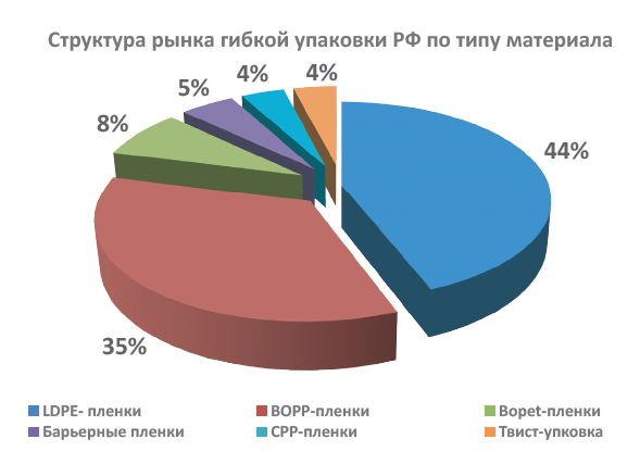 Наиболее популярными упаковочными материалами в настоящий момент являются пленки из ПВД (полиэтилена высокого давления), БОПП и БОПЭТ. Их совокупная доля составляет немногим менее 90%. Барьерные пленки, состоящие из несколько слоев и обеспечивающие полную водо- и воздухонепроницаемость упаковки, и пленки с твист-эффектом, разработанные специально для кондитерской промышленности, занимают еще 5% и 4% соответственно.